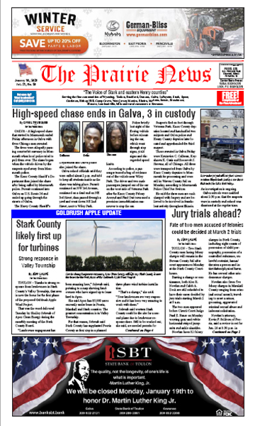 • HANNA CITY – A Farmington man appeared to avoid injury from a single-vehicle wreck south of Hanna City. Jesse J. Ebert was driving a 2013 Chrysler shortly after 6:30 p.m. Aug. 6 in the 9400 block of W. Smithville Rd. when the driver’s-side front tire fell off the vehicle, according to a Peoria County Sheriff’s Office report. The vehicle ended up facing west in a north-side ditch.